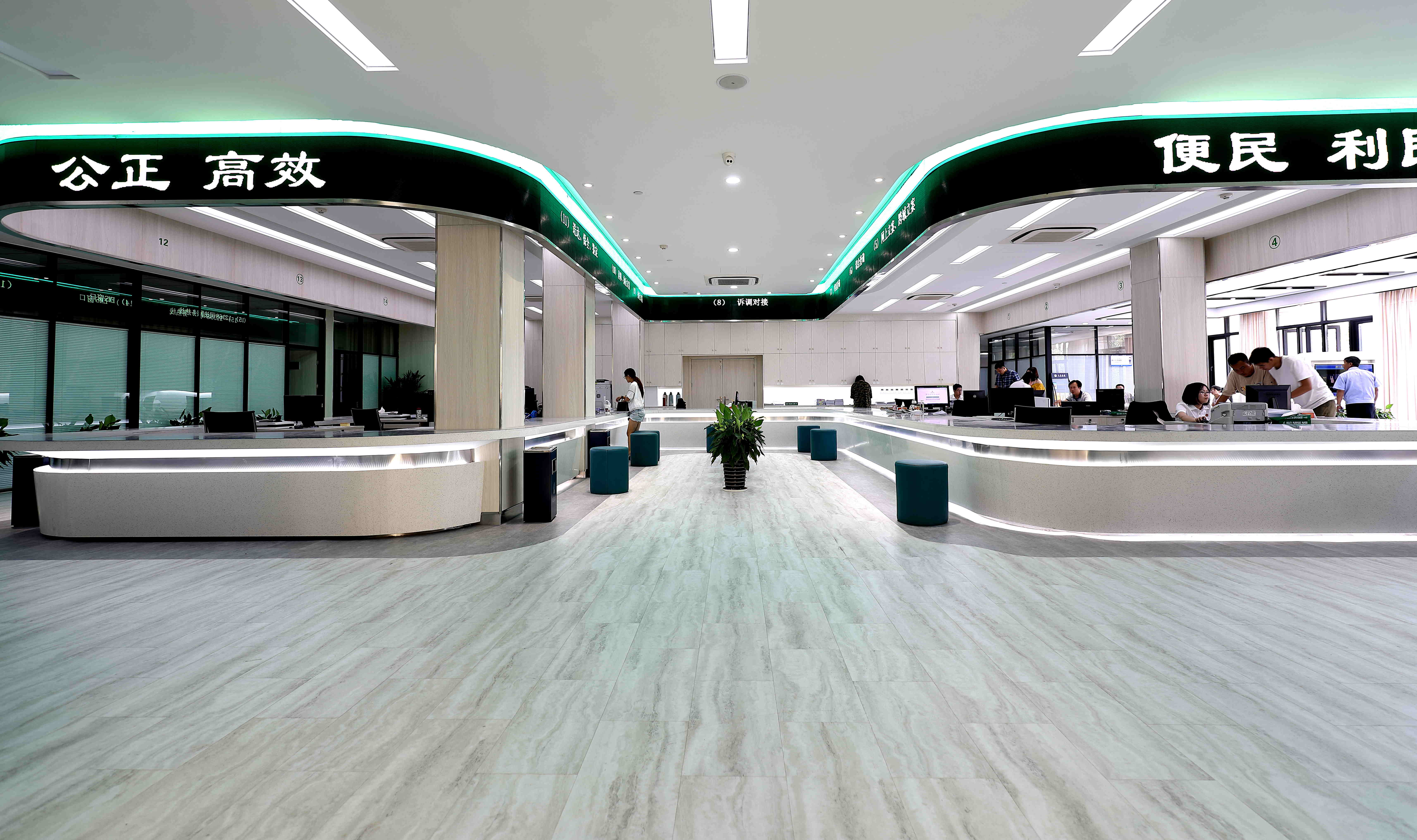 众所周知,银行等政务办公场所每天人来人往很多,由于人口密度较大,地面负荷较重,传统的地板砖或是大理石地面,经过日晒雨淋各种不同的洗礼,变得破旧脏乱,也给清洁工作带来了不便。所以需要地面材料拥有良好的耐磨性与耐刮擦性,也特别需要强调安全防滑性。这些空间地面可适当增加色彩丰富的拼花或指引标识。雨辰建材地板加倍耐用,使日常刮擦,顽固污渍和鞋跟印更难附着并易于清洁