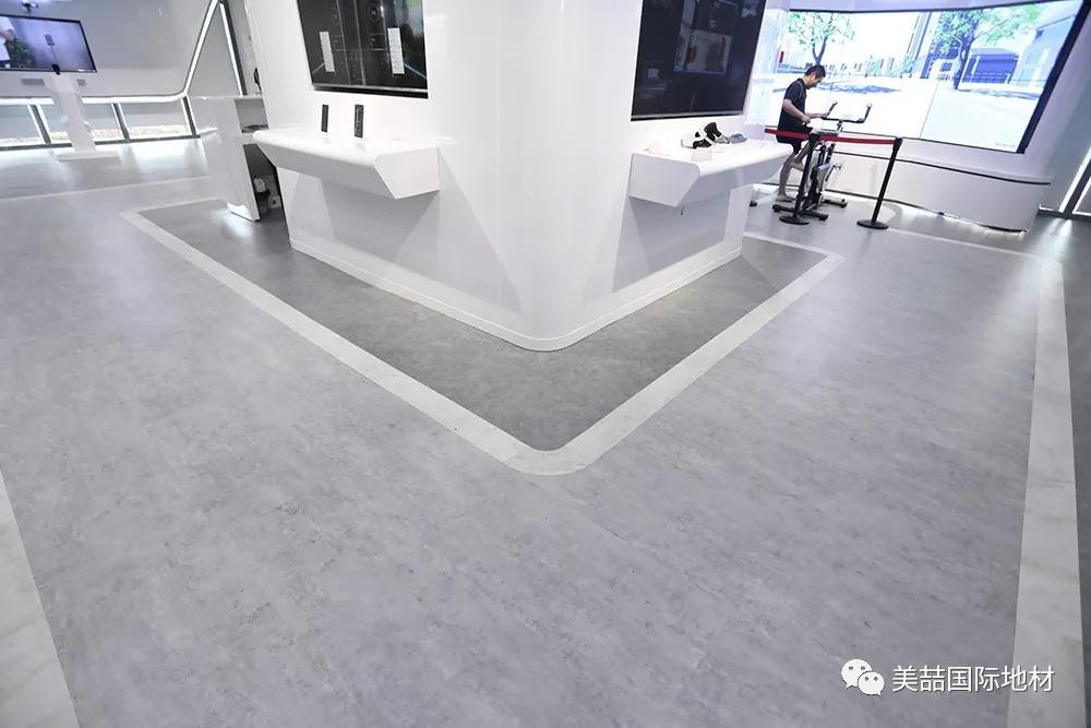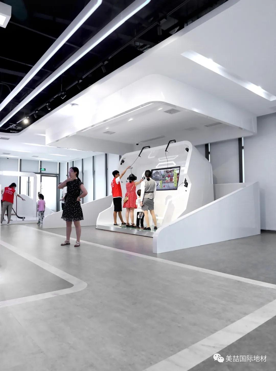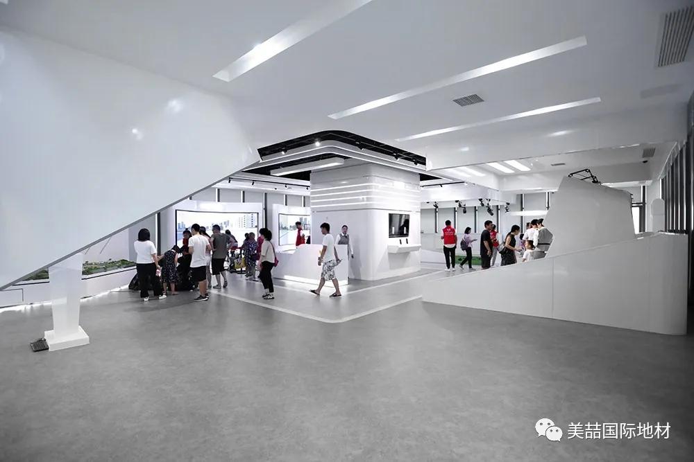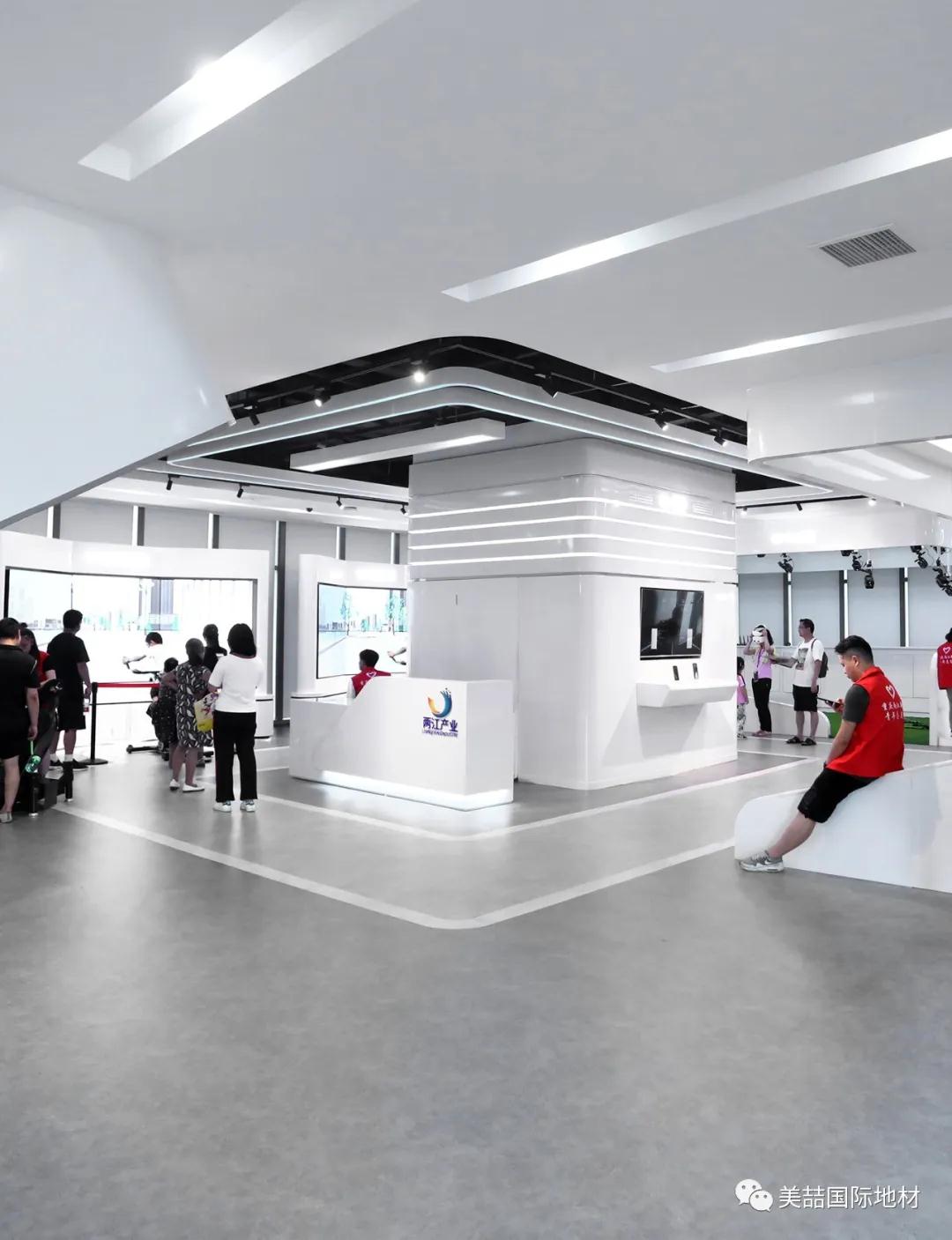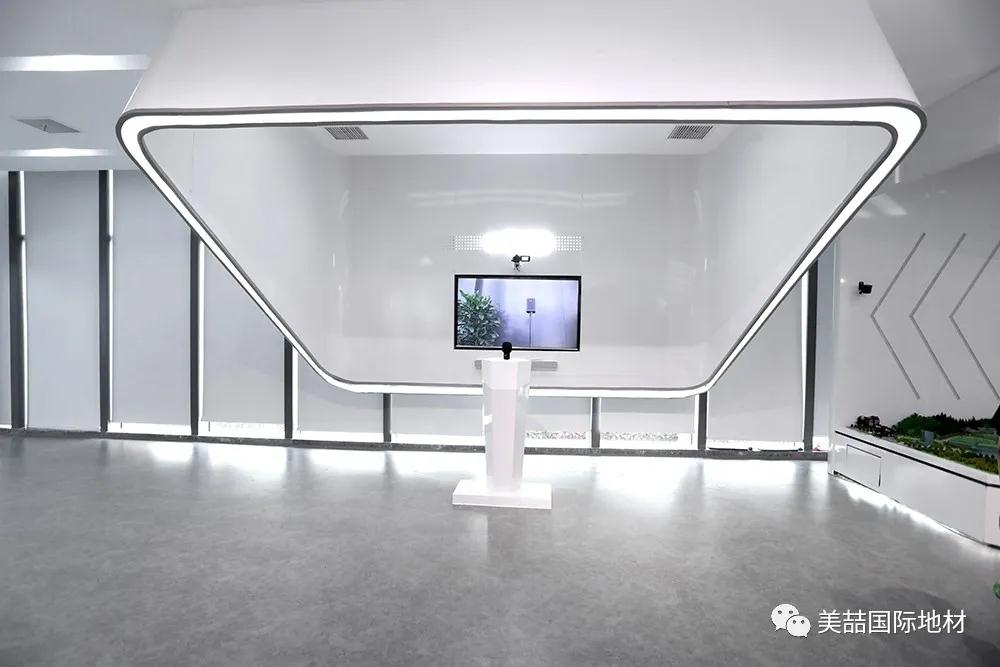 展馆主题色调为清新自然的白色,流线型的灯带,搭配美喆浅灰色石纹地板,用简约的色彩赋予整个展馆满满的科技感。