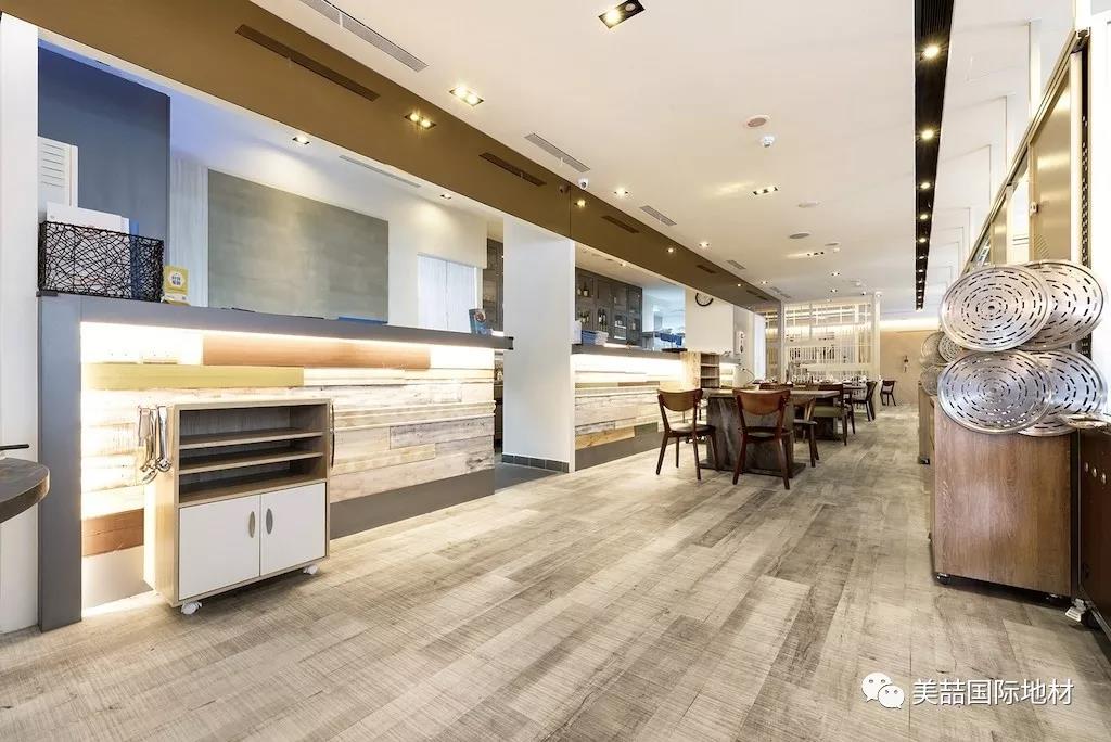 位于福建省漳州市闹市区的八合里海记牛肉火锅,正是采用色纹逼真的美喆地板来打造这种看似“破旧的现代极简主义”。