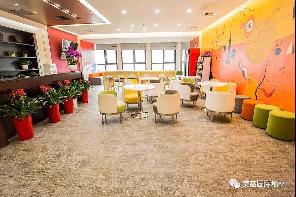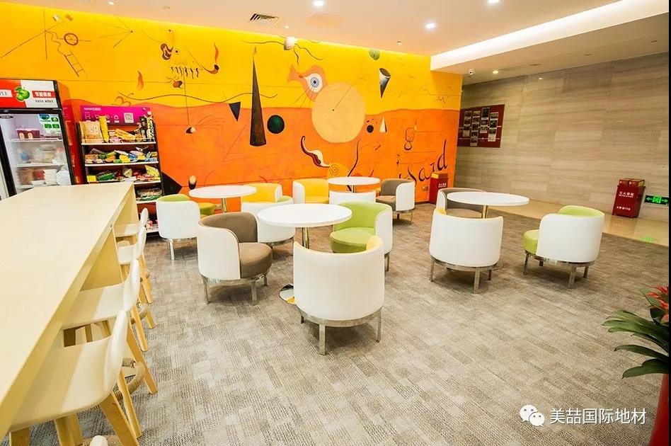 在华夏保险休闲区的应用中,美喆产品以错落的拼花形式,搭配脑洞大开的墙面绘画,打破空间的沉闷;而浅咖啡和白色的结合,能够中和丰富的色彩搭配,使色彩感受更加顺畅,解放休闲情调。