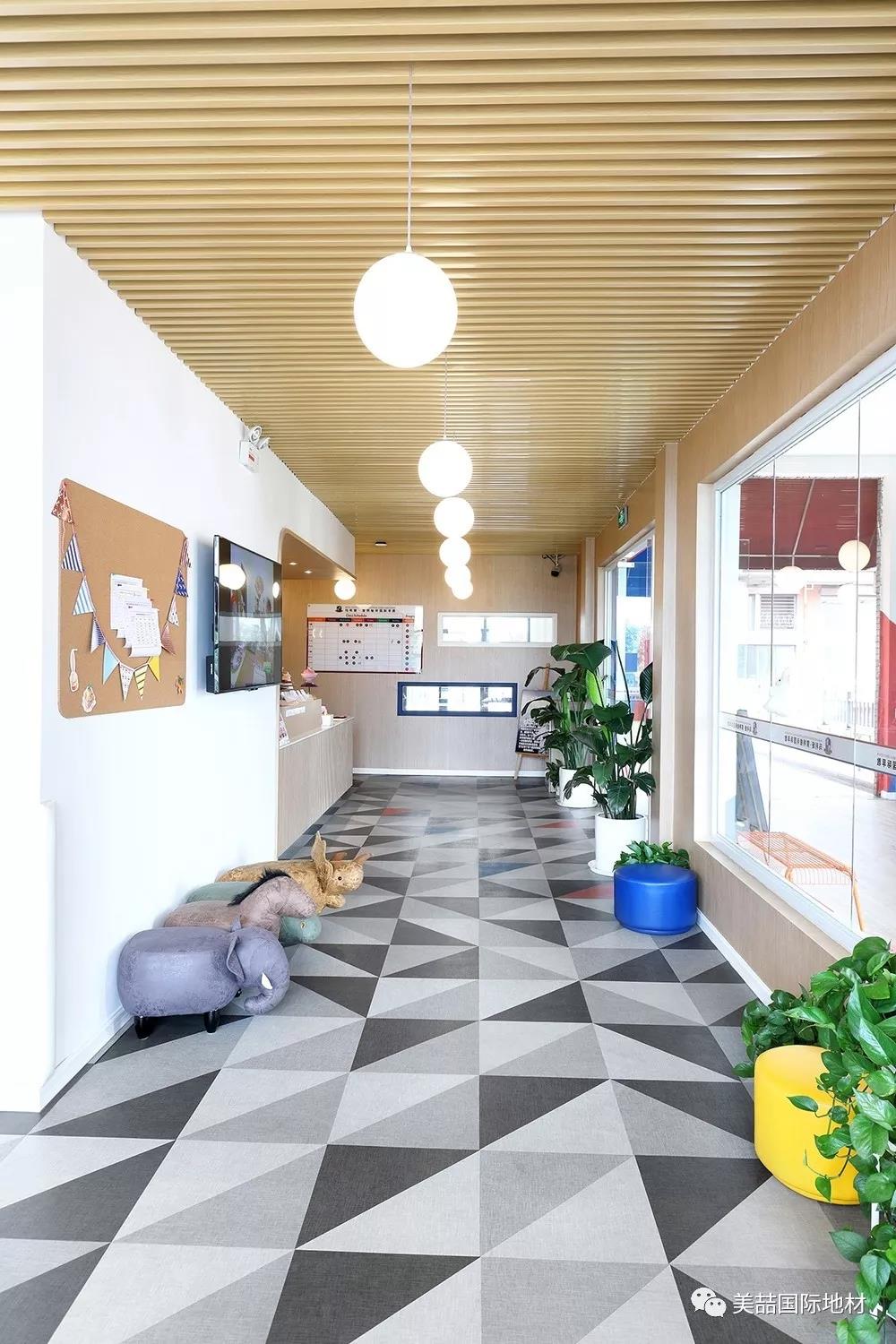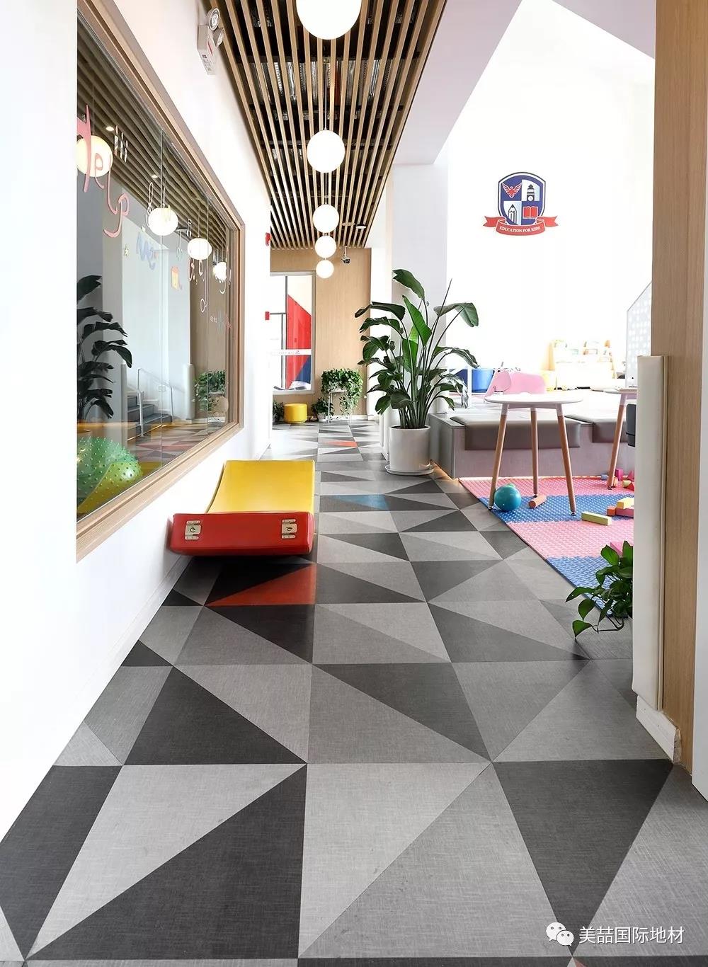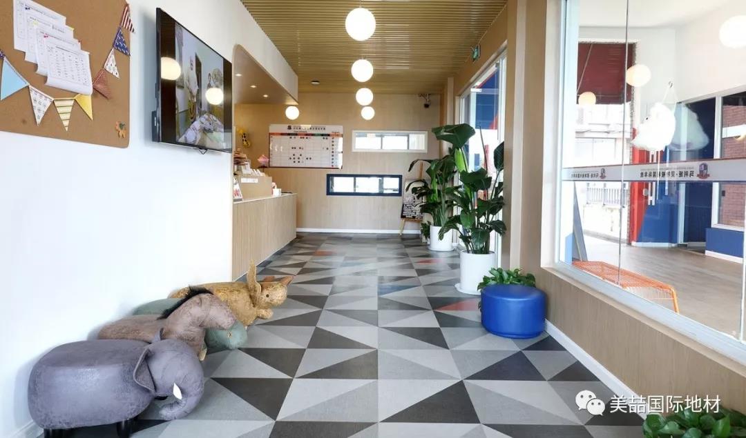 在美喆石塑地材的表面,有一层特殊的经高科技加工的透明耐磨层,不但能保证地面铺装的历久弥新,还自带出色的吸音效果,是小朋友活动量较大的早教机构的明智之选。