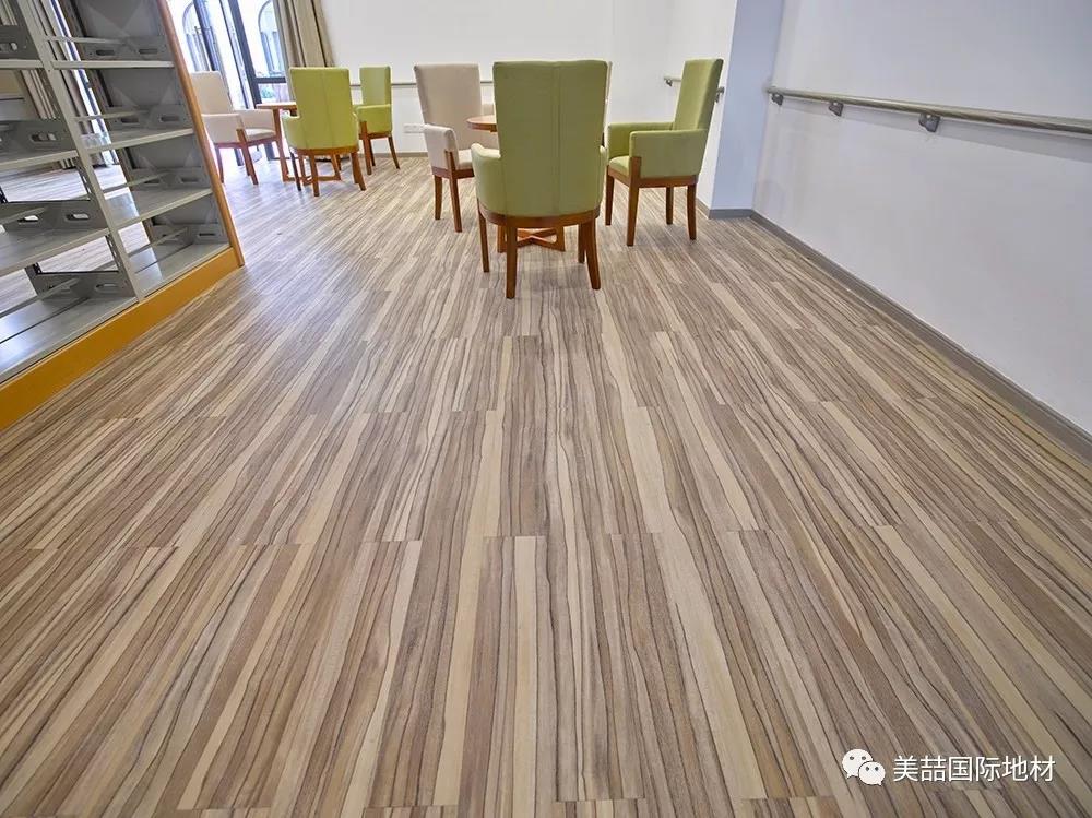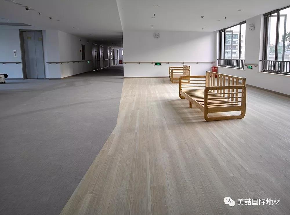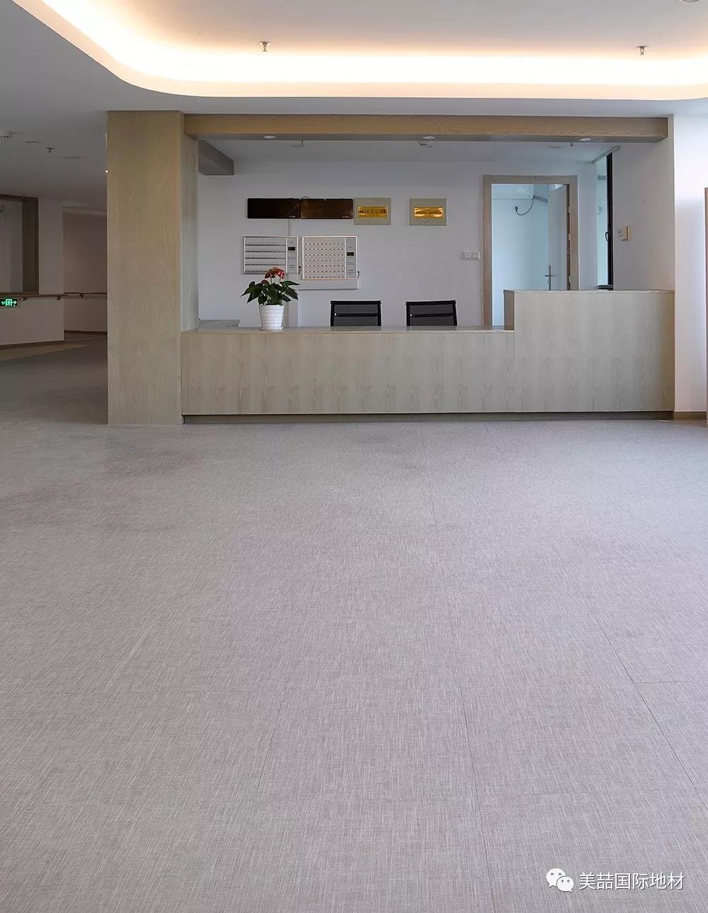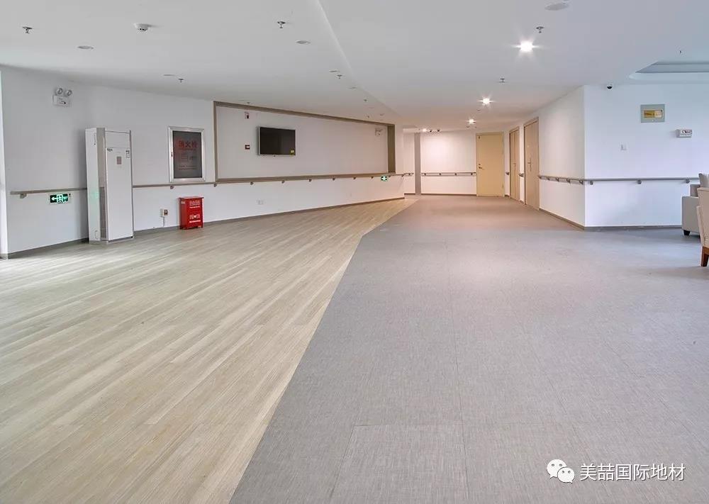 应用于公共区域的美喆产品,在暖色的灯光下呈现柔软和自然的光感,并同时因为不同的纹理而产生了自然的分区效果,减少了空间分割带来的逼仄,鼓励长者们走出房间、参加活动,有利于弱化老年生活的孤独感,让长者们放松心情。